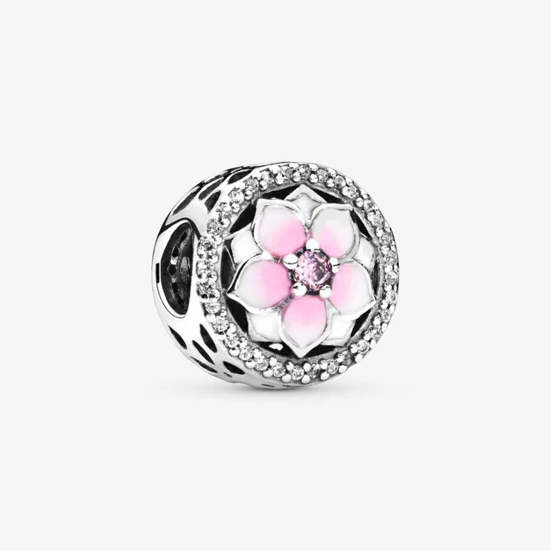 Este hermoso charm Separador Flor Magnolia Rosa añade un toque de elegancia y sofisticación a cualquier outfit. Elaborado con una delicada flor de magnolia, el dije será el complemento perfecto para tu brazalete.