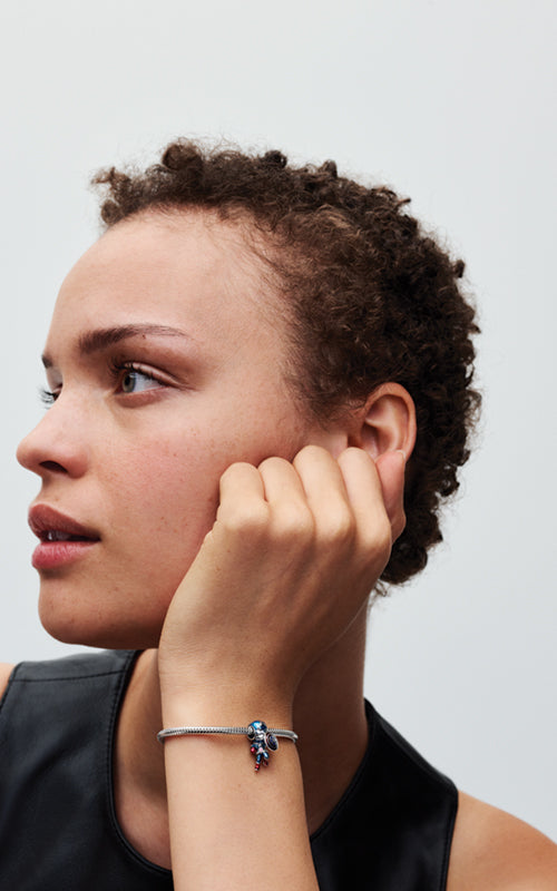 Aférrate a tu héroe con el Colgante Marvel Los Vengadores Capitán América. Elaborado en plata de ley, este colgante representa al icónico héroe en plena acción, como si estuviera en medio de una importante misión. La figura está cubierta de esmalte azul aplicado a mano y lleva su característico escudo con el símbolo de una estrella, que representa su amor por los Estados Unidos. Este encanto único Marvel x Pandora Vengadores representa la esperanza y el liderazgo, por lo que llevarlo como un recordatorio de la fuerza o un regalo para el fan de Marvel en su vida.